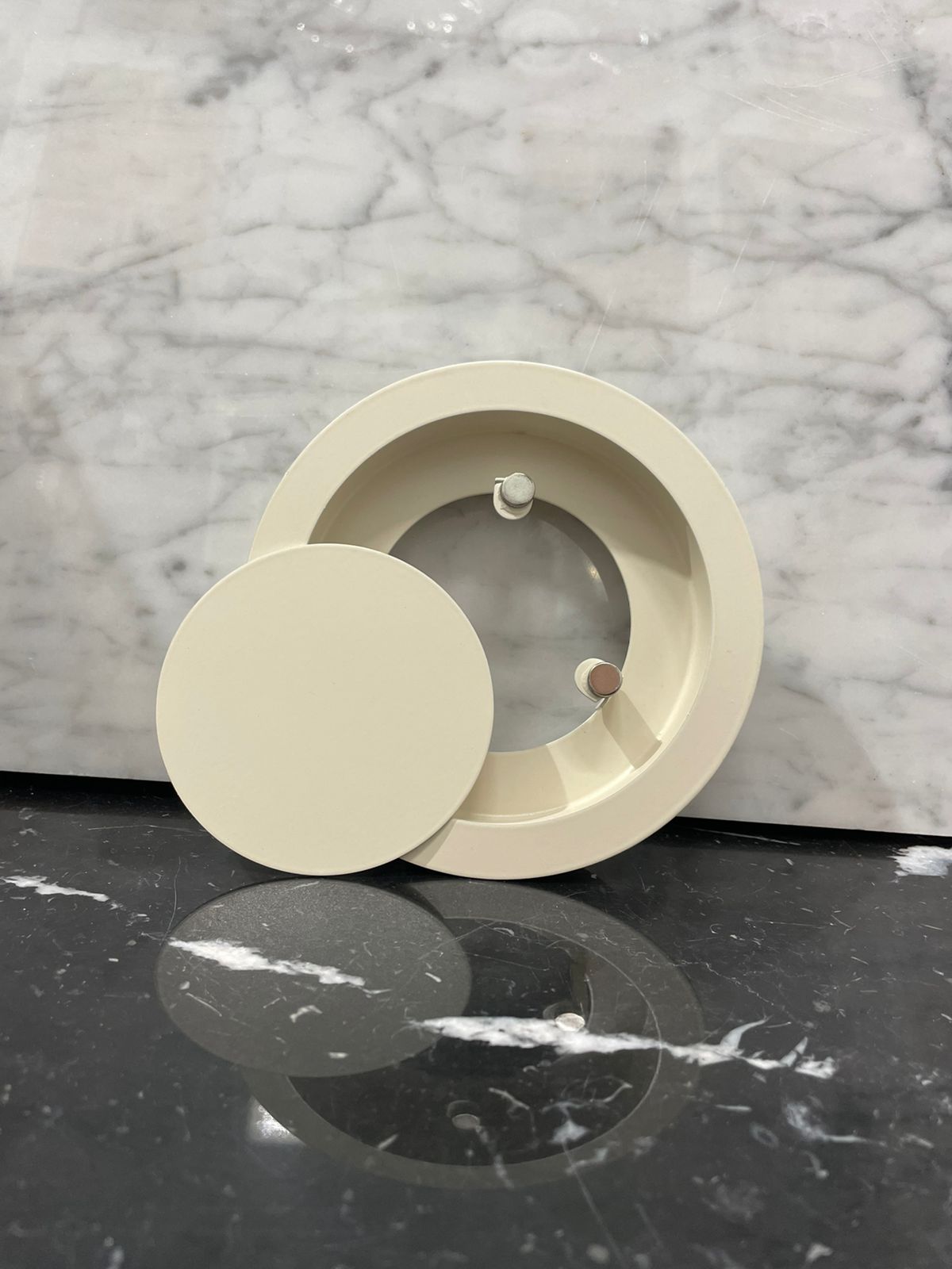 Рамка прикрепляется к стене или полотку при помощи саморезов или клея, а верхняя часть с глухой панелью фиксируется к рамке при помощи неодимовых магнитов.