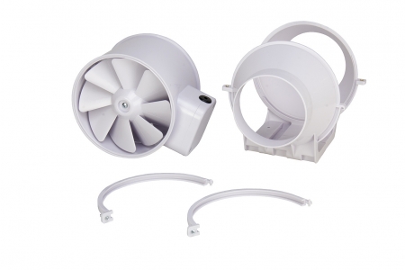 Рабочее колесо смешанного типа с диагональными лопатками, изготовлено из АБС пластика, сочетает в себе высокую производительность осевых вентиляторов и высокое давление центробежных. Лопасти выпрямителя корпуса, являясь частью рабочего колеса, сглаживают поток воздуха во избежание проблем с нисходящими потоками