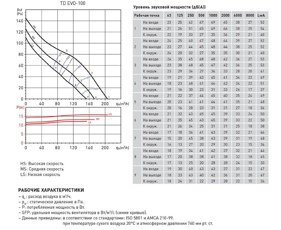 Максимальные рабочие характеристики моделей TD-EVO-VAR соответствуют кривой “HS” на графиках рабочих характеристик вентиляторов TD-EVO.