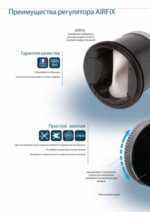 Клапан AIRFIX производится во Франции, каждый продукт подвергается тестированию с последующим нанесением технической информации на корпус с помощью лазерной гравировки. Имеет все необходимые европейские сертификаты! Клапан AIRFIX позволяют гарантировать заказчикам и проектировщикам точный расход воздуха и низкий уровень шума в каждом помещении внезависимости от квалификации подрядчиков. С клапанами AIRFIX заказчик существенно экономит на наладке!