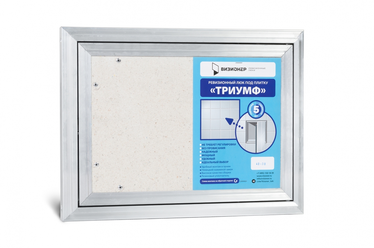 Люк, предназначен для последующей оклейки керамической плиткой, керамогранитом или другими листовыми материалами, суммарной толщиной материалов вместе с клеем, наносимых на дверцу, не более 15 мм. Люк под плитку «Триумф» сделает доступ к вашим инженерным коммуникациям максимально комфортным и минимально заметным! Чтобы открыть/закрыть дверцу, надо только легко нажать на нее, и более нет необходимости в применении дополнительных приспособлений (присоски, ручки, крючки, и т.п.).