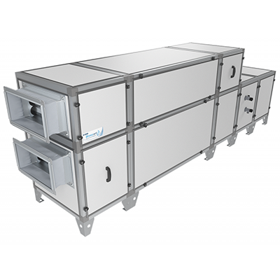 - Приточно-вытяжная установка напольного типа с противоточным пластинчатым рекуператором и системой защиты от замерзания, эффективный рабочий диапазон до -35°С с водяным охладителем и электрическим нагревателем.