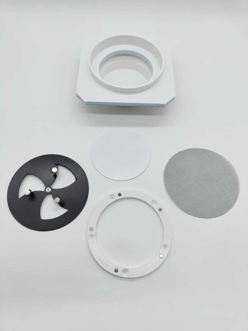 Так же диффузор состоит из металлической заслонкой, которой можно регулировать поток воздуха, либо полностью перекрыть его. К заслонке с помощью магнитов крепится декоративная круглая панелька, которую можно покрасить в цвет потолка. Так же по ободку диффузора имеется молярная сетка, для надёжной фиксации шпаклёвки. Наши диффузоры оснащены москитной сеточкой, которая препятствует попаданию насекомых в помещение.