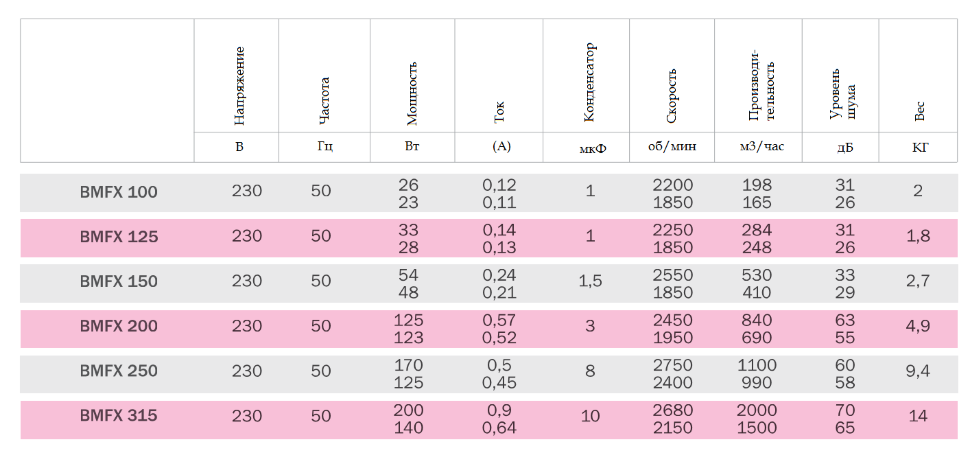 • Вентилятор изготовлен из пластика (модели BFMX 100 – BFMX 200), а у моделей BFMX 250 и BFMX 315 стальной корпус покрытый электростатической порошковой краской.
