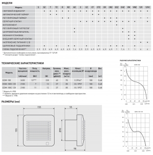 Вентиляторы EDM-100 изготавливаются из высококачественного пластика, комплектуются световым индикатором(кроме базовой модели) работы и однофазным электродвигателем (230В-50Гц), класс изоляции В, со встроенной термозащитой.